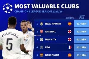 本赛季欧冠球队身价榜:皇马14亿欧居首,阿森纳、曼城、巴黎前四