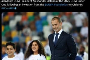 两名巴勒斯坦难民儿童受邀,与切费林一同参加欧超杯颁奖仪式